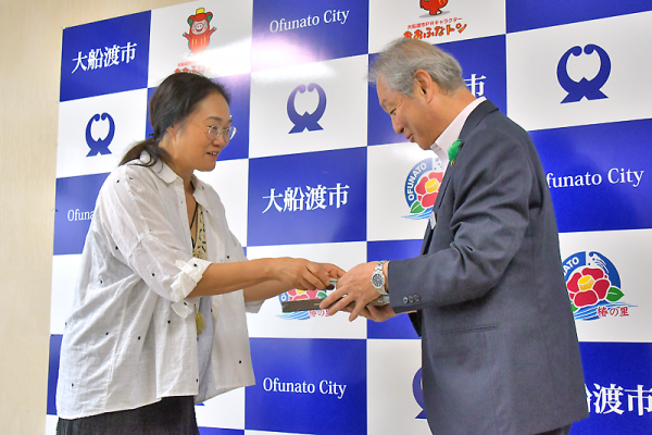 日本に戻り、報告のため新沼会長らを伴って大船渡市役所を訪問。市側は渕上市長や引屋敷努副市長らが対応した。中田さんは、ロメロ市長から預かった書籍やパンフレットといった品々を渕上市長に手渡した。