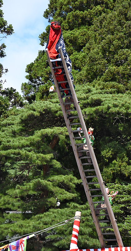大きな盛り上がりをみせた根岬梯子虎舞は、唐獅子、才坊振り、太鼓、笛の祭組メンバー約50人が出演。長さ約20㍍、計49段の梯子を舞台に命綱無しで勇壮な舞を繰り広げると、絶え間ない拍手が響いた。