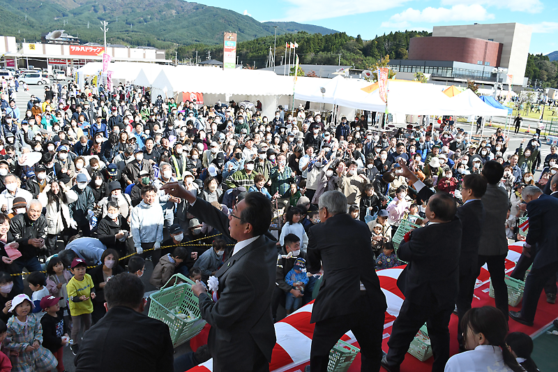 アバッセたかた駐車場にイベントステージが設けられ、気仙保育所、横田保育園、竹駒保育園児によるかわいらしい演奏や踊りの発表のあと、開会式が行われた。実行委会長の佐々木拓市長は「昨年度以上の出店数となった。笑顔あふれる産業まつりを契機に、まちなかのにぎわいをさらに創出していきたい」と力強く語った。