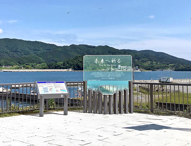 主要な構築物となる祈りのモニュメントは、縦2㍍、横1・7㍍。大船渡湾内を見ながら祈るようガラス素材とする。