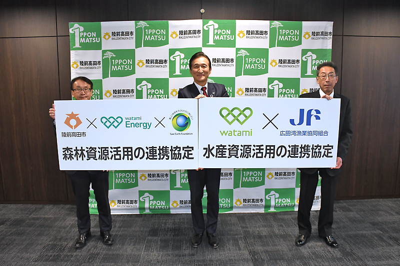 森林資源の活用に関する連携協定を締結したのは、市、渡邉会長兼社長が代表理事を務める公益財団法人SaveEarthFoundation(セーブ・アース・ファンデーション)、ワタミ子会社のワタミエナジー㈱(清水邦晃代表取締役社長)の3者。