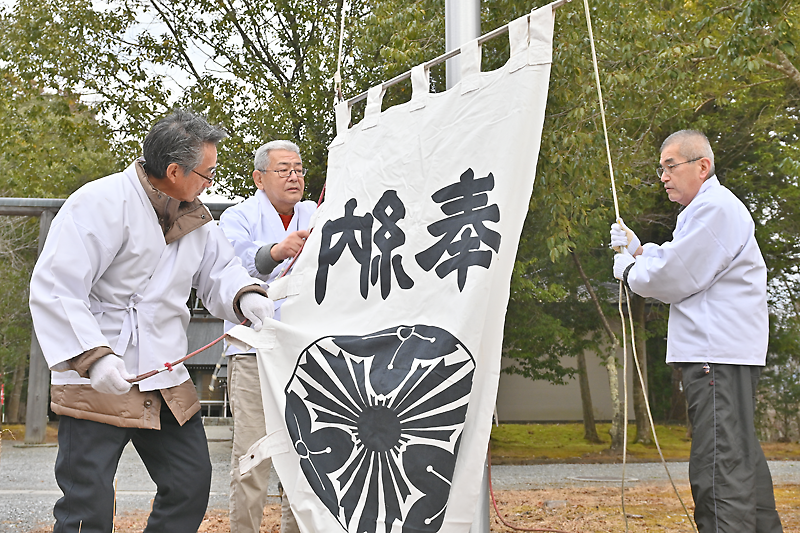 今年は20日頃からこつこつと作業を始め、お札やお守り、破魔矢などの縁起物の準備に加え、境内、参道の清掃などを行ってきた。30日は、総代3人が集まり、長谷川宮司(68)らとともにのぼり旗を掲揚したり、鳥居にサカキをくくりつける作業を行い、参拝客を迎え入れる体制を万全にした。