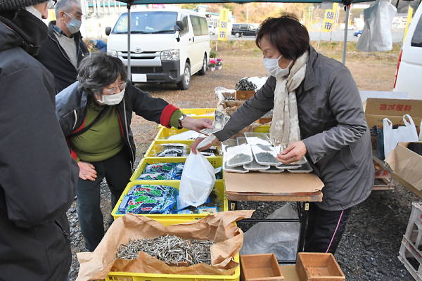 この日は魚介、乾物、花の3店舗が出店。開店の午前8時前から客が並び、タコやホタテ、ナマコといった新鮮な海産物のほか、升売りの乾物、色鮮やかな花々などを買い求めた。