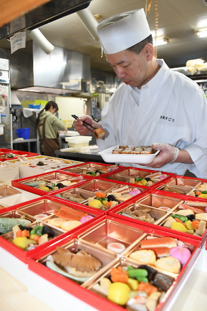 大船渡市大船渡町の飲食店「活魚すごう」は30日、正月に欠かせないおせち作りのピークを迎えた。重箱には豪華な品々が詰め込まれ、担当者は「おいしく味わってほしい」と願いを込めた。