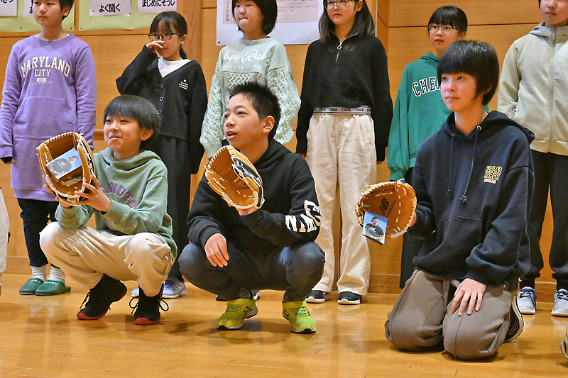 「大谷翔平選手からグローブが届いています」と伝えられると、児童らは「おぉ~」と顔をほころばせた。グローブの説明に続き、「このグローブが私たちの次の世代に夢を与え、勇気づけるためのシンボルとなることを望んでいる。野球しようぜ」などと書かれた大谷選手のメッセージを紹介した鎌田校長は、「これは飾っておくためのものではなく、皆さんに使ってほしいとプレゼントしてくれたもの。大谷選手の思いとともに、大事に仲良く使って」と呼びかけた。