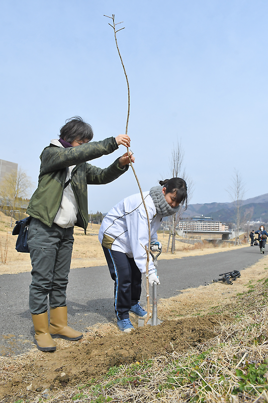 記念植樹した佐々木拓市長は「有志が立ち上げたプロジェクトの第一歩を地元の卒業生が担ってくれた。美しいサクラの名所になってほしい」と期待を込めた。