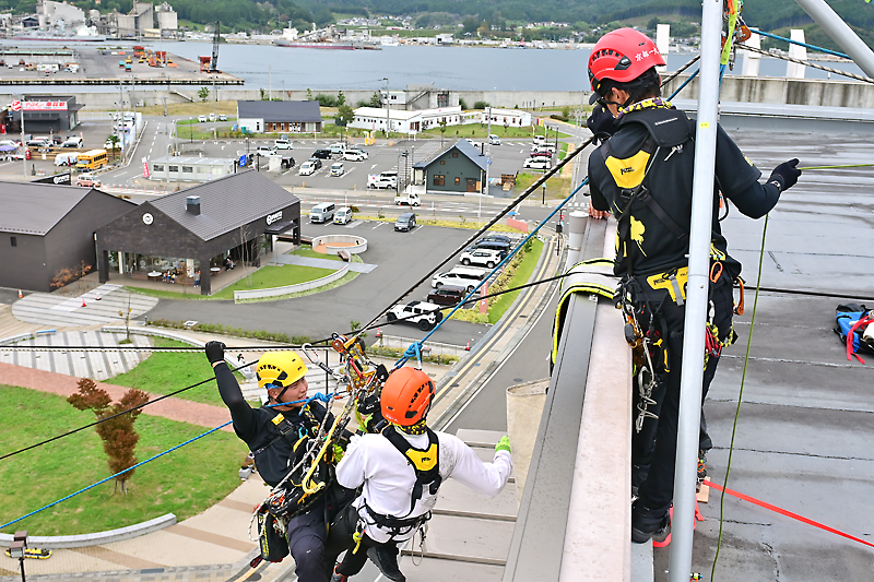 おおふなぽーとの展望デッキと大船渡プラザホテル屋上における救助では、両施設にわたされたロープをつたって要救助者のもとに向かった。競技者は、これまで培ってきた技術と装備を駆使して時間いっぱいロープを握り、チームワーク良く競技に力を注いだ。