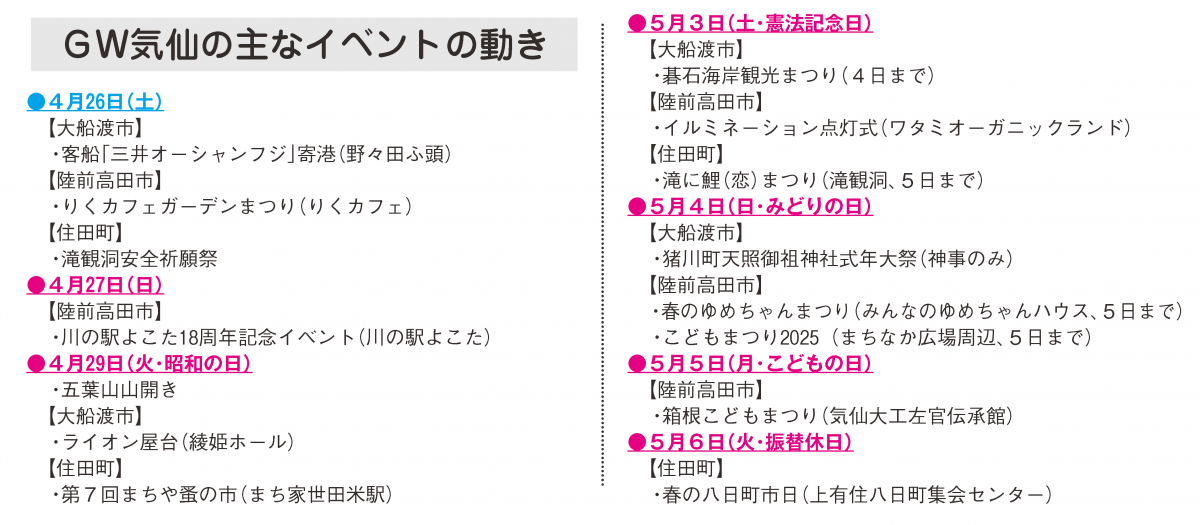 きょう26日から、ゴールデンウイーク(GW)に入る。屋外で過ごしやすい時期になり、気仙各地で県内外からの観光客らを迎える定番イベントや、子ども向けの催しが計画されている。一方で、大船渡市大規模林野火災や三陸花火大会開催中止の影響も。日本気象協会による5月5日(月・祝)までの天気予報では、くもりや晴れの日が多く、まずまずの行楽日和が続きそうだ。
