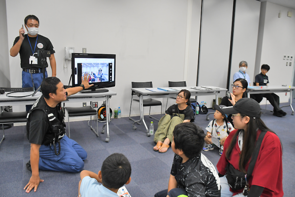センター内の心肺蘇生法、AED体験ブースでは、ライブ119を実演。119番通報時に伝えきれない現場の状況を、通報者がスマートフォンで撮影したライブ映像で消防に視覚的に伝える仕組みで、参加者は心臓が停止した人への応急処置を教わるとともに、119番通報やライブ119の一連の流れを確認した。