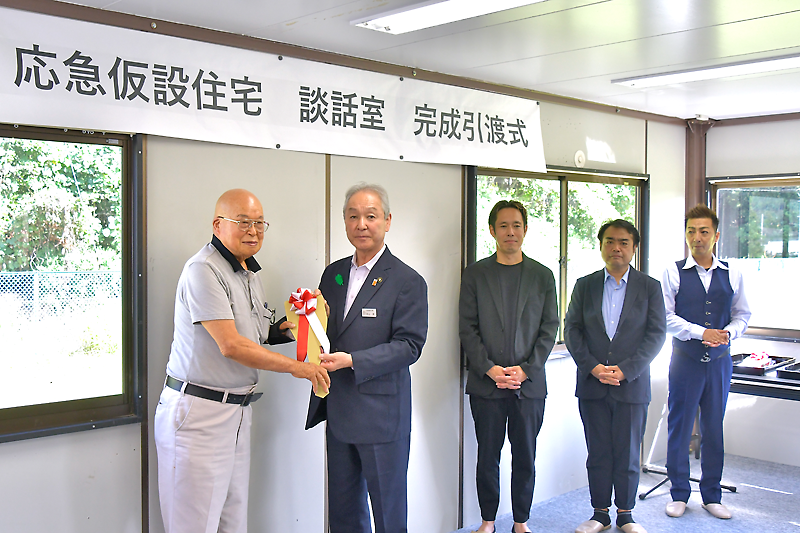 支援した両団体から渕上市長に手渡された鍵のレプリカは、各仮設住宅の代表者に引き継がれた。関係者による記念撮影も行われ、整備に対する感謝や一日も早い復興への願いなどを込めながら笑顔を交わした。