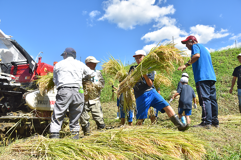 作業中、地元の介護施設「ひころいちの郷」の利用者が駆けつけ、明るい声援で作業を後押し。児童らは、住民によるコンバインでの収穫風景も見学し、学習田の稲を全て刈り終えたあとは脱穀作業も手伝った。米が食卓に並ぶまでの、多くの人の努力に理解を深めた様子だった。