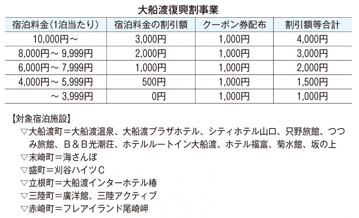 市はコロナ禍にも「大船渡に泊まってHappy!大作戦」と称して宿泊費の助成事業を進め、第1弾は令和2年9月~3年2月、第2弾は同年7月~4年1月に、第3弾は同年9月~5年1月に実施した。今回は平日利用に限定し、助成額も細分化していることから、利用・予約は落ち着いた動きとなっている。