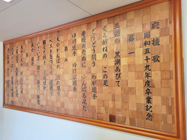 同校校舎内の一角に「昭和五十九年度卒業記念」と記された木製のパネルがある。パネルには、第一から第三まである同校の応援歌が刻まれており、歌詞を見ると「三陸の黒潮あびて」「母校のために」など、地域の象徴や母校を思う言葉が並ぶ。小学校で独自の応援歌を持っているのは市内でも珍しいが、いつからか歌われなくなっていた。