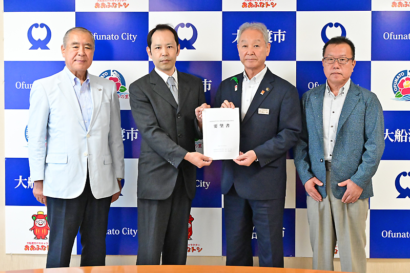 要望書の提出は同市役所で行われ、木下、鈴木両会長と、署名活動を行う「大船渡東高校・食物文化科をみんなで護る会」の会長に就任した米谷春夫大船渡商工会議所会頭らが出席。市側は渕上清市長、小松伸也教育長らが臨んだ。