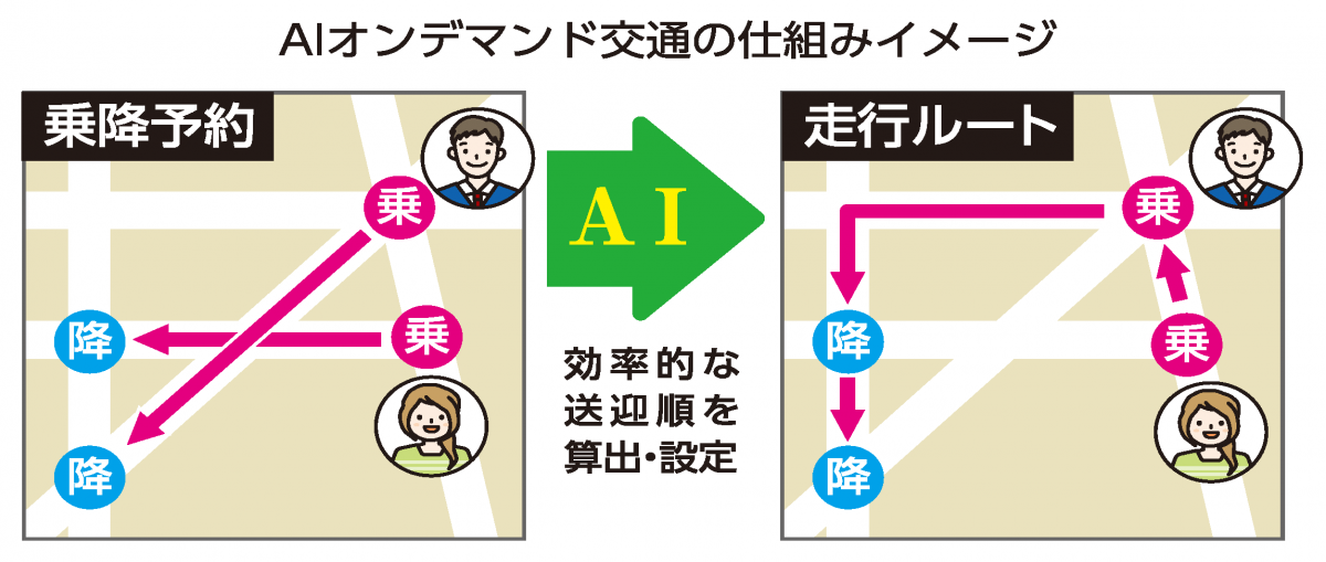 AIオンデマンド交通は、時刻表や決まった経路を設定せず、予約状況などに応じてAIが選んだ最適ルートを走るサービス。スマートフォンのアプリやコールセンターへの電話などで配車予約を受けて運行する。