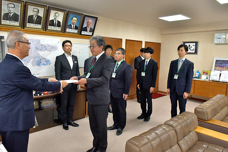 交付式には、谷澤技師を除く4人が出席。渕上清市長は一人一人に辞令書を手渡し、「今回の林野火災では、延焼範囲が広大かつ急峻な地形に及んだ一方、森林災害復旧の事業期間が限られていることから、着実性と迅速性を両立した取り組みが大きな課題となっている」と述べた。