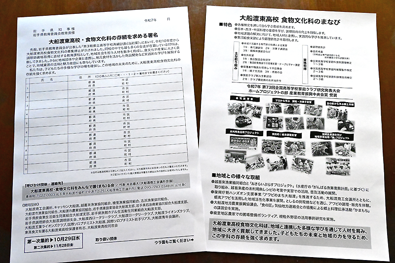 署名用紙の大きさはA4判で、両面刷り。表面には、食物文化科が地域社会を担う人材育成や食文化、産業に大きく貢献していることなどを示し、「私たちは、子どもたちの多様な学びの場を確保し、この地域の未来のために、大船渡東高校食物文化科の存続を強く求めます」として、10人分の署名欄と賛同団体名などを記した。