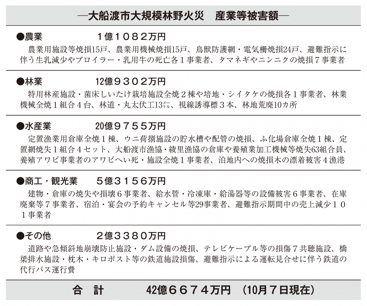 大船渡市大規模林野火災における産業などの被害額が、今月7日時点で42億6674万円に上ることが分かった。林業関係は林地荒廃被害を加えたことで増えたが、全体の森林被害は依然として調査中で、総額はさらに増す見通し。被災建物の公費解体は、対象の約3割に当たる68棟で終え、完了した地域も出てきている。(佐藤 壮)