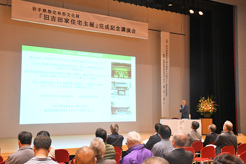 陸前高田市気仙町の県指定有形文化財「旧吉田家住宅主屋」完成記念講演会と、同主屋の日本遺産「みちのくGOLD浪漫」構成文化財認定記念シンポジウムは11日、高田町の市コミュニティホールで開かれた。登壇した有識者らが、東日本大震災で全壊した主屋の復旧に至るまでの道のりや歴史を再確認し、今後の活用にかかる展望についての思いを来場者と共有した。