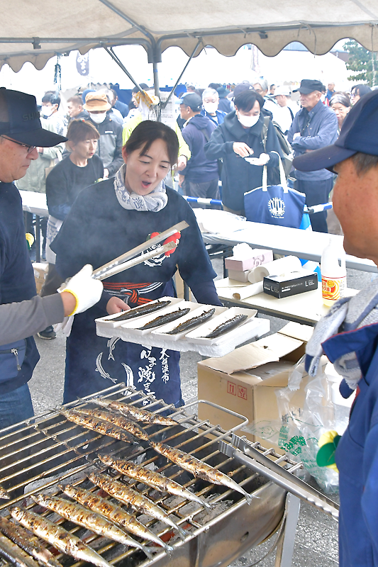 屋外でのサンマの炭火焼き提供では「さんま焼き師」がじっくりと焼き上げ、歓迎の思いを香りに乗せた。今年は大ぶりの魚体が多いとあって、市内外から楽しみにしていた来訪者が列をつくった。