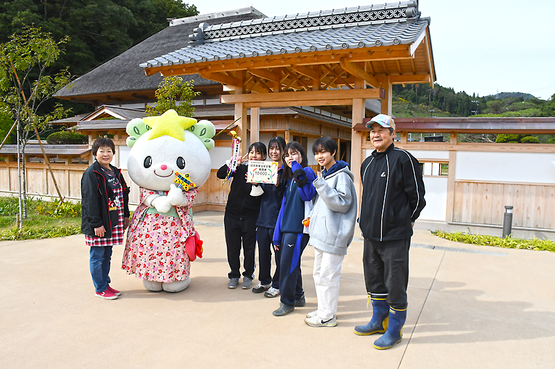 市のPRキャラクター「たかたのゆめちゃん」が駆けつけ、生徒たちを祝福。正門の前で手のひらサイズのミニくす玉を開披し、その後、生徒たちは主屋で干し柿作りを体験した。