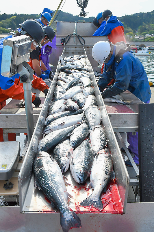 2季目の今年は、新たにトラウトサーモンを加え、5月中旬〜7月上旬に水揚げを行った。数量はギンザケ約139㌧、トラウトサーモン約83㌧だった。
