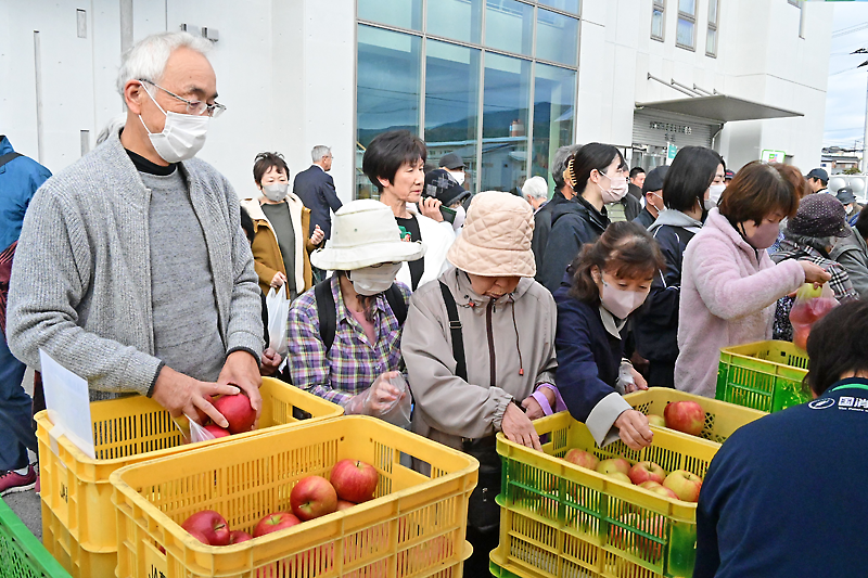 駐車場では、林野火災からの復興応援も込めて、地元の新鮮な農畜産物、Aコープ商品、菓子などの加工品を販売。子ども向けの縁日コーナーも設けたほか、「米崎りんご」の詰め放題、JA青年部によるミニトマトすくいも好評を博した。