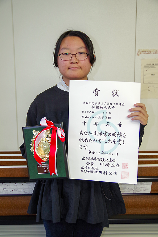 日本将棋連盟大船渡支部(平山敏夫支部長)に所属する大船渡市立第一中出身の中谷天音さん(南昌みらい高2年)が、盛岡市で24日に開かれた第44回県高校文化連盟将棋新人大会(県高文連など主催)の女子個人戦で優勝。前回大会から連覇を達成し、12月の東北大会、来年1月の全国大会へと意欲を見せている。