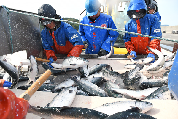 2季目は新たにトラウトサーモンを加え、今年5〜7月に水揚げした。数量はギンザケ139㌧、トラウトサーモン83㌧の計222㌧だった。