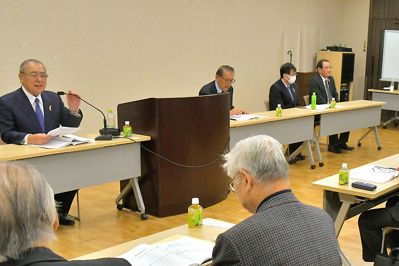 大船渡商工会議所の第74回臨時議員総会は4日、盛町の同商議所で開かれた。任期満了に伴う選挙や選任で決まった新議員らが出席し、会頭に米谷春夫氏(78)=㈱マイヤ代表取締役会長=を再任。副会頭は細川廣行氏(74)=東北汽船港運㈱代表取締役社長、橋爪博志氏(55)=橋爪商事㈱代表取締役社長=が引き続き務めるほか、新たに菊池透氏(65)=㈱アースデザインコンサルタンツ代表取締役社長=が就いた。正副会頭らは、活力あふれる地域経済に向けた各種取り組みの充実を誓った。(佐藤 壮)