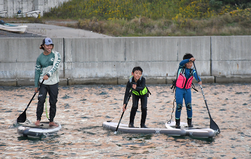 クラブ名は、植田さんが店主として切り盛りする広田町のSUP専門店名を冠した「THE BLUE SUPジュニアクラブ」。所属しているのは佐藤天晴さん(米崎小5年)と佐々木湊斗さん(同)で、7月に市内で開かれた体験会をきっかけに入会した。