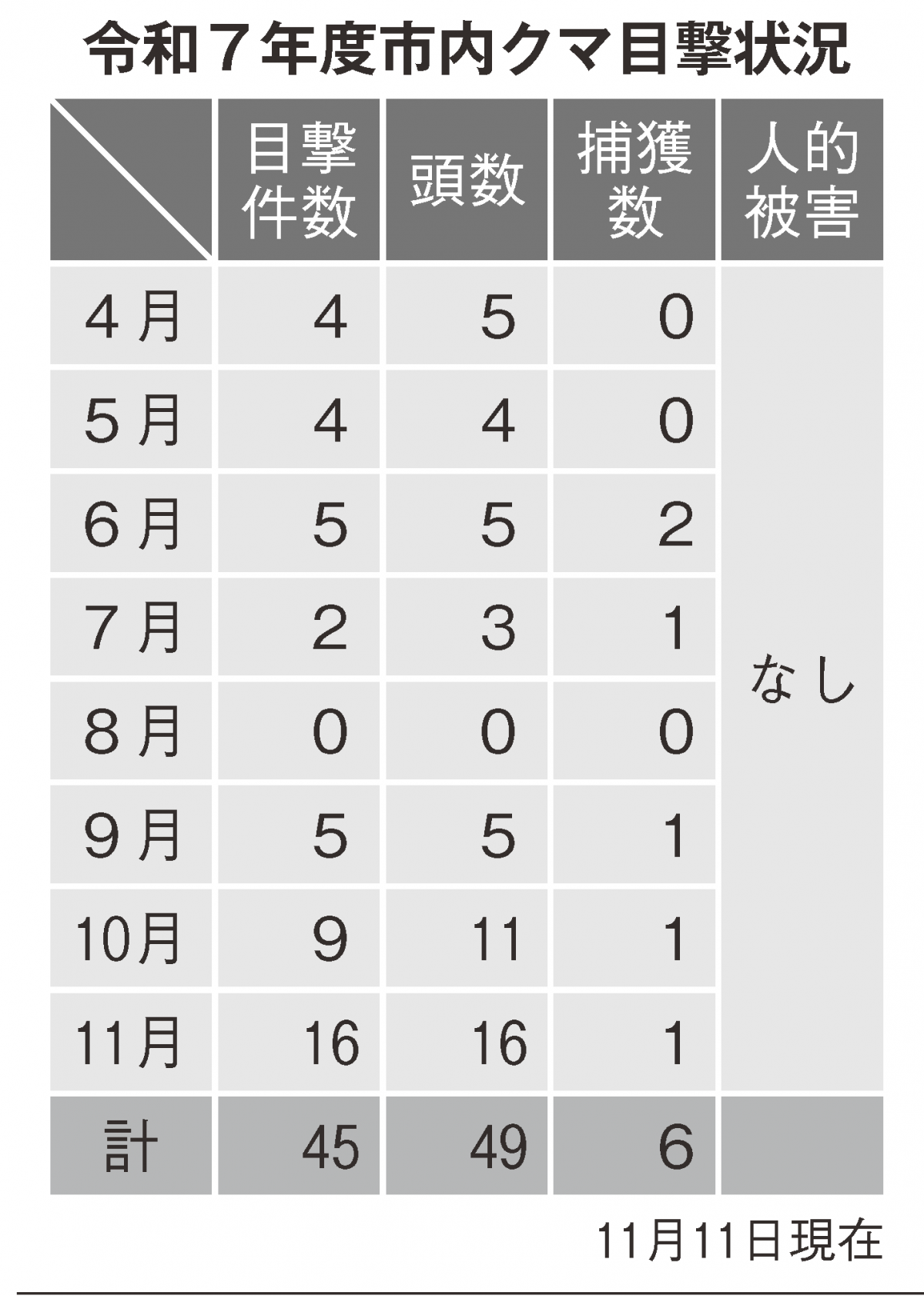 本年度、市内では4月から6月まで月4、5件の目撃情報が寄せられた。夏に一度、落ち着いたが、9月に入って再び増加。同月は6月と同数の5件、10月は9件となり、今月は11日時点で16件と、それまでで月間最多の10月をすでに上回っている。