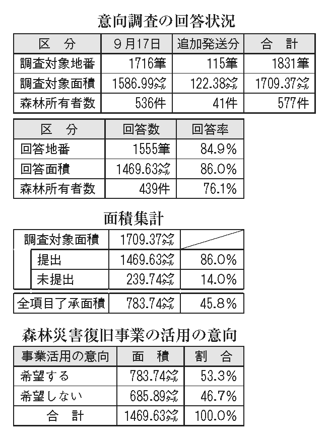 森林災害復旧事業を「希望する」と回答したのは、813筆(52・3%)で、面積は783・74㌶(53・3%)となった。「希望する」と回答した全てで、造林後の森林管理や森林保険の加入に同意した。