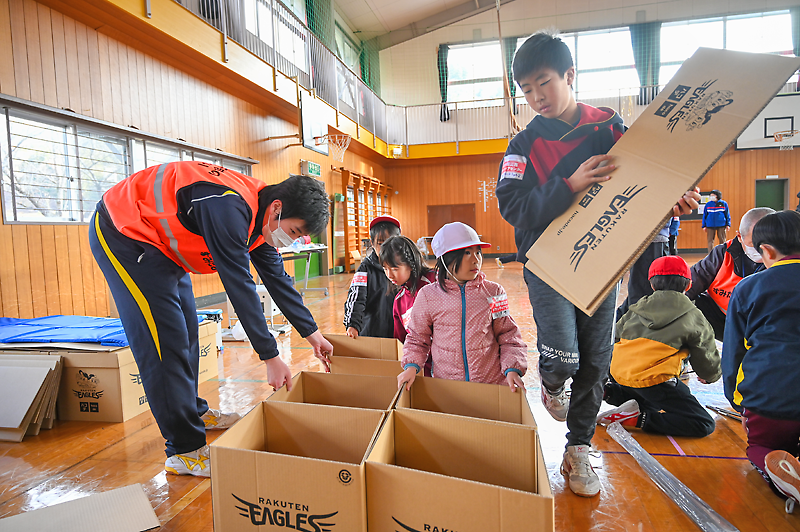 児童らはその後、6グループに分かれて段ボールベッドとテントの組み立て、設置を体験。