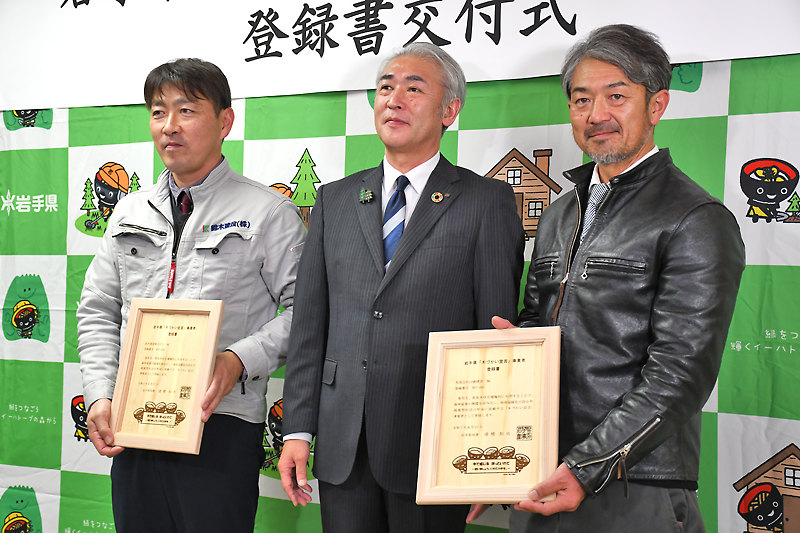 陸前高田の2事業者に交付 県の「木づかい宣言」 登録書は林野火災被災木製 盛岡で