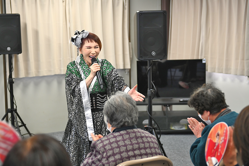奥野さんは冒頭、「大船渡で一番最初に入ったのがここ(綾里・黒土田仮設)だった。今度は火災でまた同じ場所に仮設が建ち、それで慰問に来るのは正直うれしくなかった。でも、皆さんに会えたことはうれしい。私にできるのは一生懸命歌うことくらい」と語り、ライブをスタートさせた。