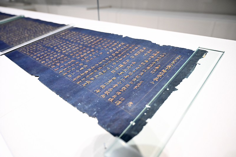 中尊寺経は、平安時代後期の東北地方で勢力を誇った藤原清衡・基衡・秀衡の3代によって同寺に奉納された仏教経典の書写の通称。このうち、秀衡が奉納したとされる、紺色に染めた紙に金泥で経典を書写したものが「紺紙金字一切経」。奉納された約5300巻のうち、中尊寺に残っているのは2800巻ほどで、そのすべてが一括して国宝に指定されている。