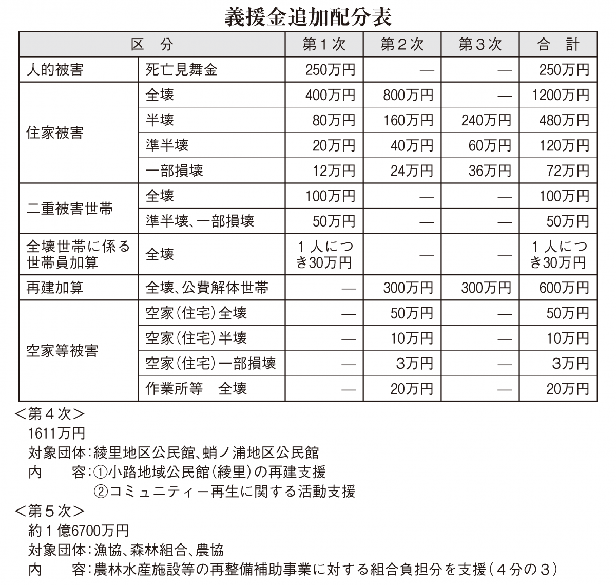 第5次をもって義援金の配分は終了。11月末時点での残額4億5637万円に関しては、被災した山林所有者の支援に充てる。土壌保持や保水力といった治山機能など、森林の公益的機能の低下が懸念される森林の災害復旧促進に向けて市の基金として積み立て、国の激甚災害指定に伴う森林災害復旧事業の対象とならない経費の支援に充てることにしている。