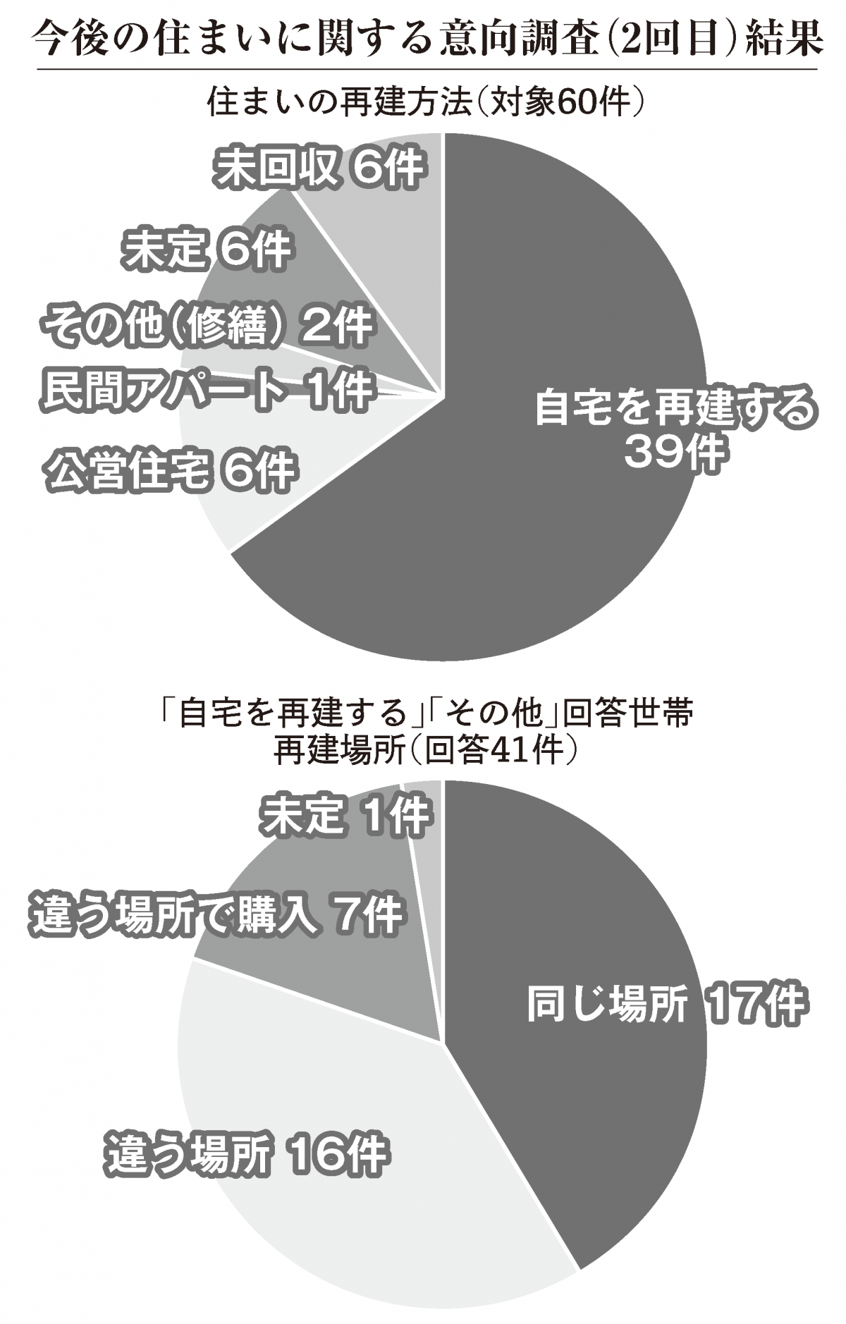 この中では「同じ場所」が17件(41・5%)と最も多かった一方、「被災前とは違う場所での再建」16件(39%)と「違う場所での購入」7件(17・1%)の合計が23件(56・1%)と過半数に達した。全回答対象者に占める同じ場所での再建希望は、3割を切った。
