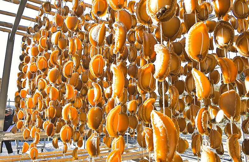 水揚げされたアワビの身を塩水に漬け、ゆでたあとに炭火でいぶし、糸を通してつなぎ、屋外に並べる。太陽の光を浴びると、あめ色に輝き、独特の香ばしさが広がる。こうした〝干鮑のれん〟の光景は3月ごろまで続き、香港向けなどに出荷される。