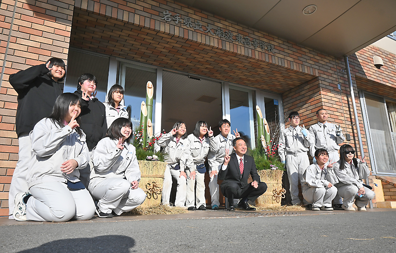 ○…大船渡市立根町の県立大船渡東高校(今野晋校長、生徒204人)の職員玄関前に23日、農芸科学科3年生13人が製作した門松が設置された。生徒らが授業で学んだ知識と技術を生かして手作業で作り上げ、新年を明るく迎えるとともに、来年3月に卒業を控える3年生の新たな門出に期待を込めた。