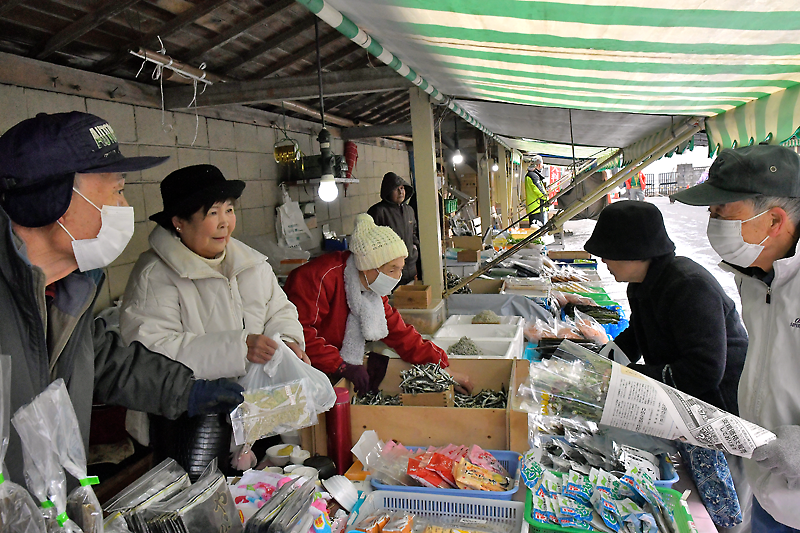 ○…この日は市内外の約20業者が並び、水産加工品や果物、乾物、正月花などが並んだ。晴れ間が広がったものの風がやや強く、路面には雪が残る中での開催となった。