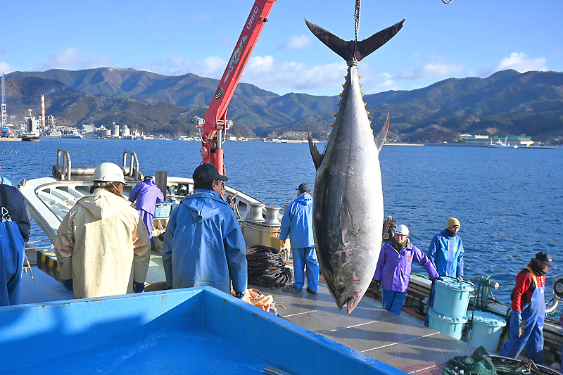 昨年8月に発生した急潮により、経営する2カ統の定置網が被害を受け、今年復活した吉浜漁協の大鮑、横沼両漁場は、船で194~103㌔のクロマグロ3匹やメジマグロを運んだ。青空に銀色の大きな魚体がつり上げられ、関係者の注目を集めた。定置網では、スルメイカも2㌧揚がった。