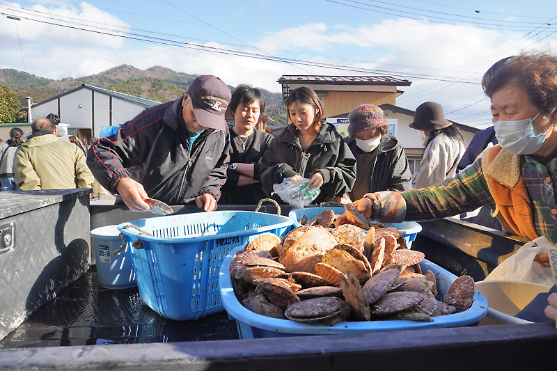 この日は越喜来で漁業を営む田村蓄養場、第7天王丸、松丸、中野えびす丸の4業者が、トラックの荷台などを売り場にして出店。会場ではかごいっぱいに積まれた殻付きのホタテをはじめ、袋詰めの生ガキやナマコ、煮アワビなどが販売された。