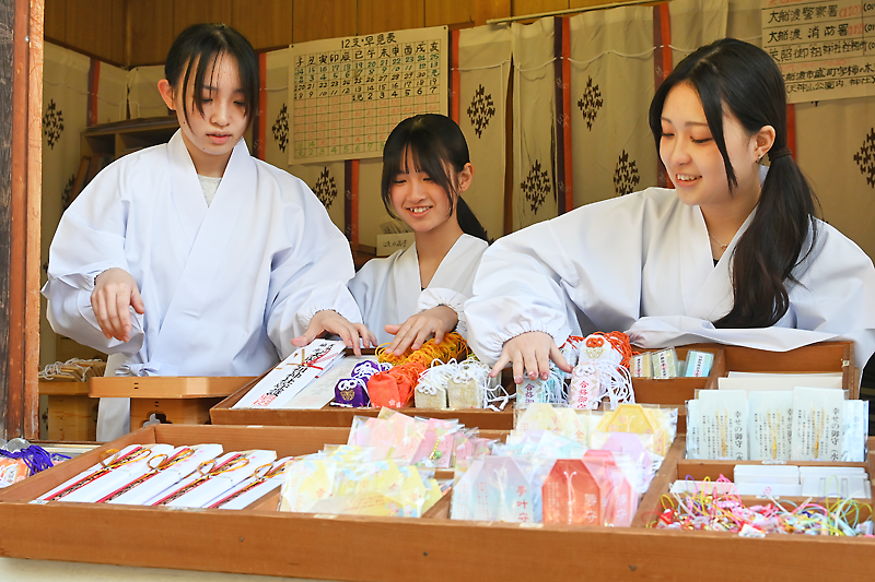 今年もこつこつと準備を進め、同日は三が日にみこを務める同市出身の吉田夢果さん(18)、大船渡東高3年の紺野碧花さん(18)、藤田琉花さん(18)の3人が、販売するお札やお守り、絵馬などを並べ、元日に備えた。吉田さんは「住民の方々に気持ちよく参拝に来ていただけるように、心を込めて接したい」と意気込んだ。