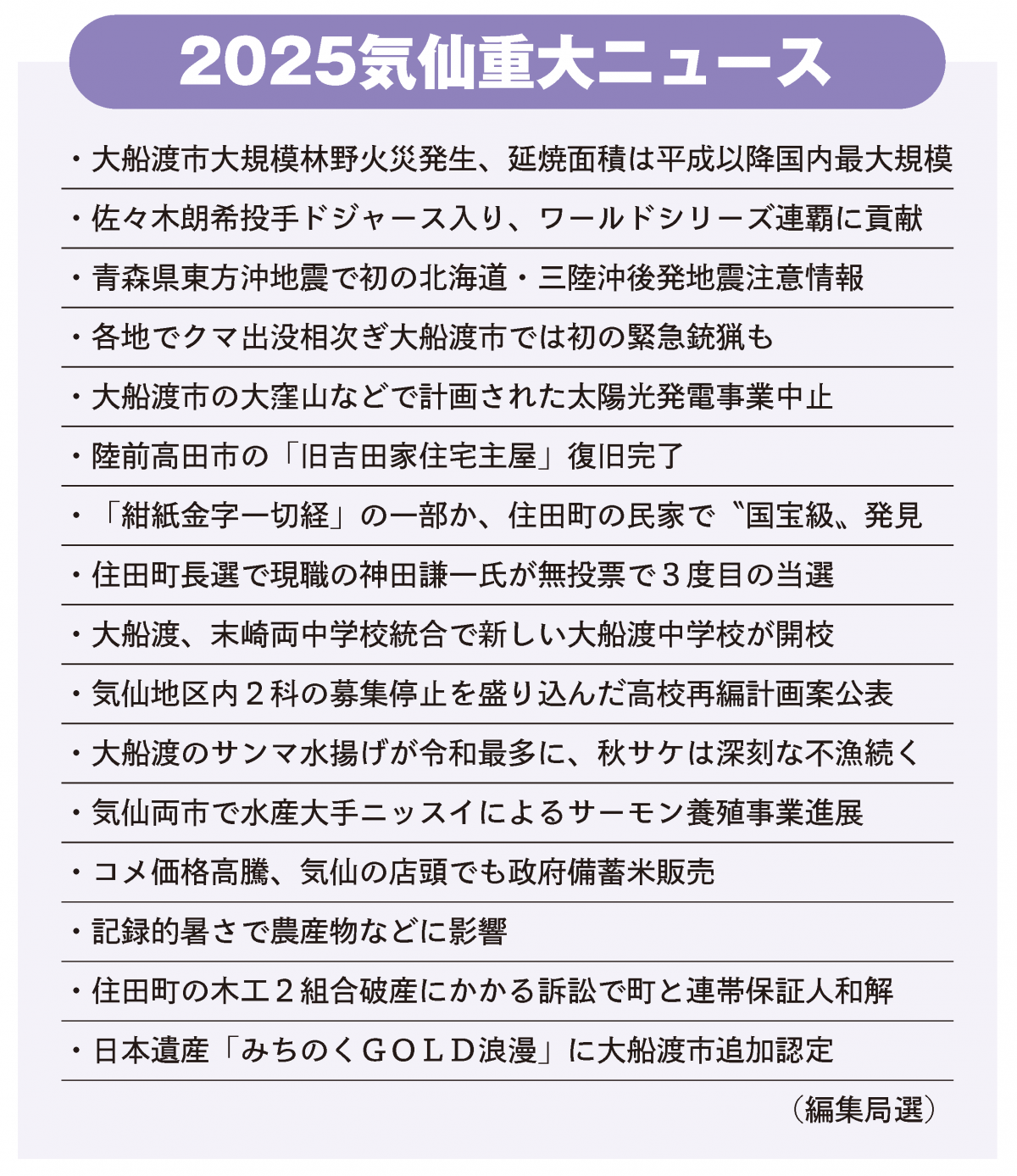 令和7(2025)年も、きょうを残すのみ。東日本大震災から14年目となった中で大船渡市大規模林野火災が発生し、平成以降国内最大規模の延焼面積に至る大きな爪痕を残した。複数回の津波注意報・警報もあり、災害対応や備えを再確認する機会ともなった。夏の記録的な暑さ、秋に相次いだクマの出没は、住民の暮らしに影を落とした。一方、挑戦の舞台を米大リーグに移した古里の星・佐々木朗希投手の躍動をはじめ、地域に活気をもたらす話題も相次いだ。今年の気仙を月ごとの主なニュースで振り返る。(文中の年齢や肩書きは当時)