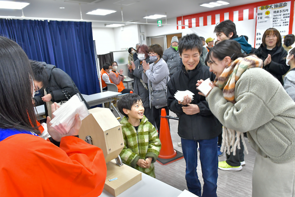 1等を当て「ニンテンドースイッチ2」を手にした綾里小の佐々木匡さん(1年)は「6回回して最後に当てた。狙っていたのでうれしかった」と笑顔。昨年2月の大規模林野火災で自宅が被災しており、一緒に訪れた家族とともに「今年はいいことがあるように」と喜びを分かち合った。