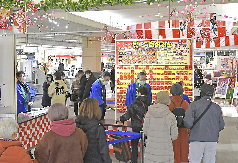 列はスムーズに流れ、開始30分で終了。山口徹副理事長(65)は「さまざまな店舗が初売り企画をしている中でサン・リアを選んでいただき、ありがたい。明るく良い年になっていけば」と期待を込めた。