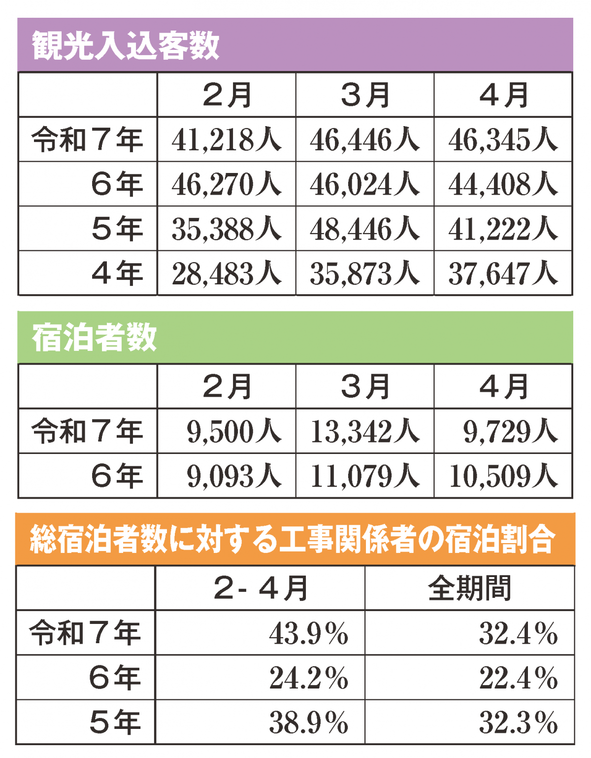 この間、工事宿泊者の割合は43・9%を占めた。令和5、6年の実績を上回り、市街地や幹線道路沿いの宿泊施設では、工事関係者の利用で市全体の宿泊者数を下支えした半面、観光目的の宿泊は落ち込み、大規模林野火災の影響が大きく出た施設もあることが読み取れる。