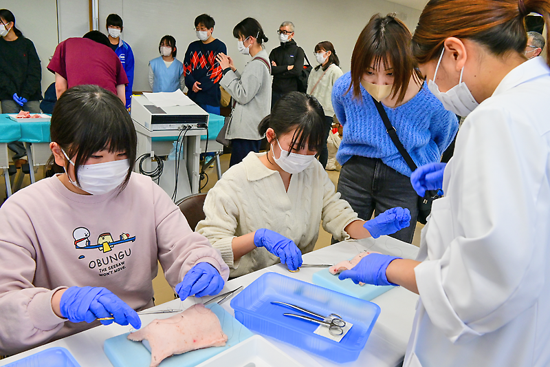 このうち、縫合では手術で使うメスや針、糸などの器具を使用。参加者らはメスでブタの皮を切り、その部分を針と糸で縫い合わせた。指導には星田院長らが当たり、「上手、上手」「速くするよりきれいに縫う方が患者さんのためになる」などと子どもたちに呼びかけた。